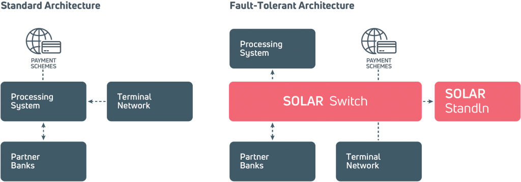 Le secteur des paiements met de plus en plus de pression sur les infrastructures de paiement pour qu’elles maintiennent un niveau élevé de tolérance aux pannes. Alors qu’il y a seulement cinq ans, l’arrêt des transactions pendant la nuit était autorisé dans certaines régions, aujourd’hui, même un arrêt de 10 minutes à minuit est un incident de catégorie critique qui porte un coup à la confiance des clients. Il n’est donc pas surprenant que les sociétés de traitement des paiements investissent massivement dans le développement de solutions de traitement complètes à haute disponibilité. SOLAR Stand-in, un système d’autorisation de réserve, propose une amélioration considérable de la fiabilité de votre système de traitement actuel. Bien qu’il ne soit en aucun cas destiné à remplacer votre système existant, qui fonctionne sans problèmes, le système de réserve SOLAR remplit l’écrasante majorité des fonctions nécessaires au traitement des paiements avec une tolérance maximale aux pannes.